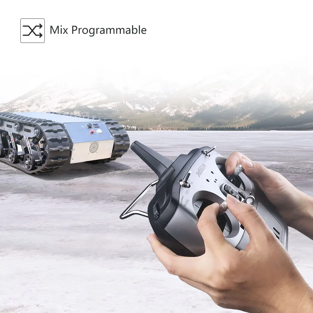 Leveres med ekstra deler for sentrering av throttle stikke, hvis man ønsker det, for eks de som vil bruke den til lastebil, gravemaskiner etc, og kabel for oppgradering og programmering av software. Lang rekkevidde. Radioen fungerer og kan brukes som den er rett ut av esken, eller man kan omprogrammere og skreddersy en hel rekke funksjoner ved hjelp av Blue Tooth via smart telefon eller PC.